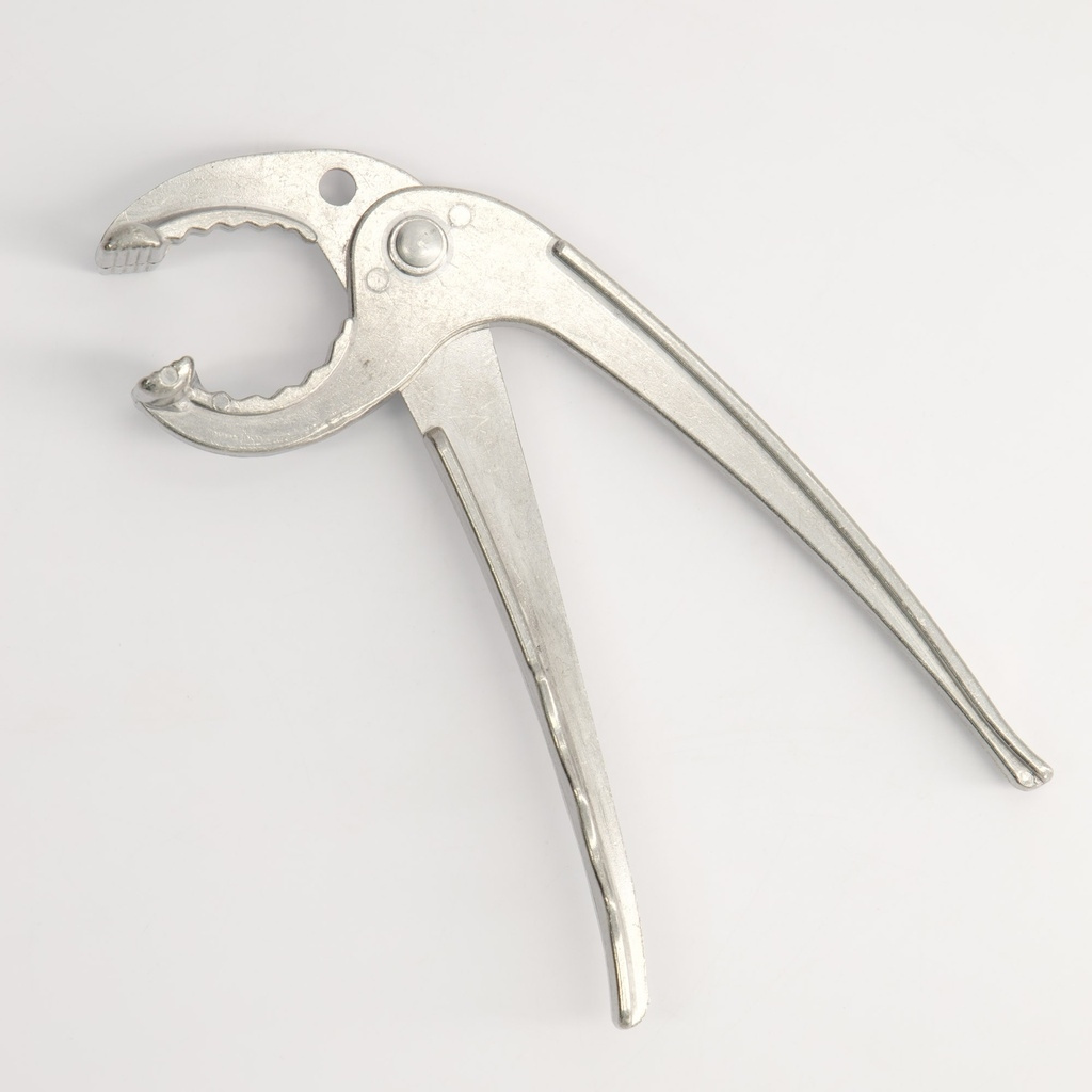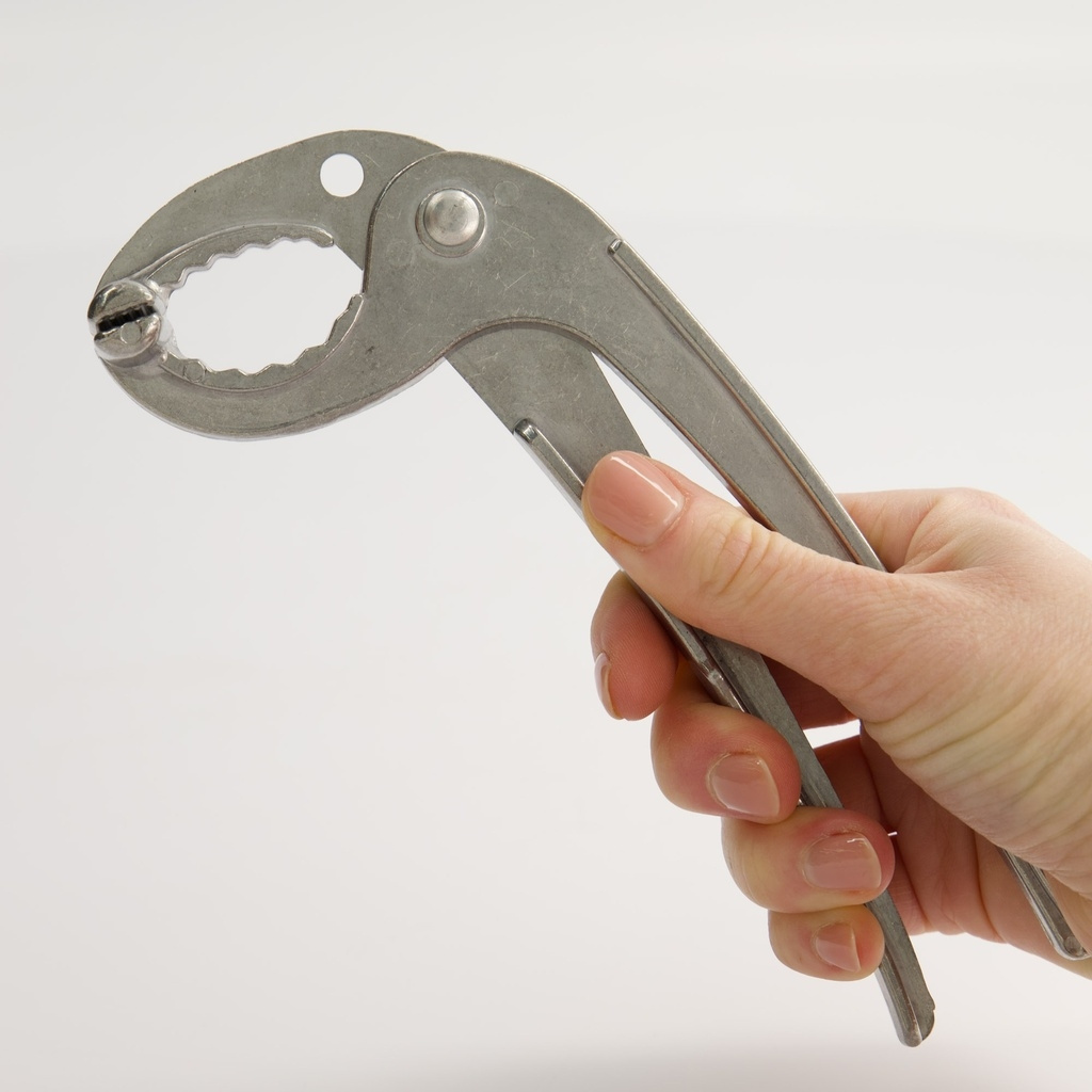 Ce modèle en métal est conçu pour s'agripper fermement au bord d'un dolsot ou d'un autre bol de service chaud sans endommager la surface ou glisser. La forme de la pince est spécialement conçue pour les bols en grès à parois épaisses utilisés pour le bibimbap, mais elle convient également aux petites marmites en fonte et autres récipients chauds. La poignée est inclinée pour éloigner la main de la chaleur tout en assurant un bon contrôle lors du service.