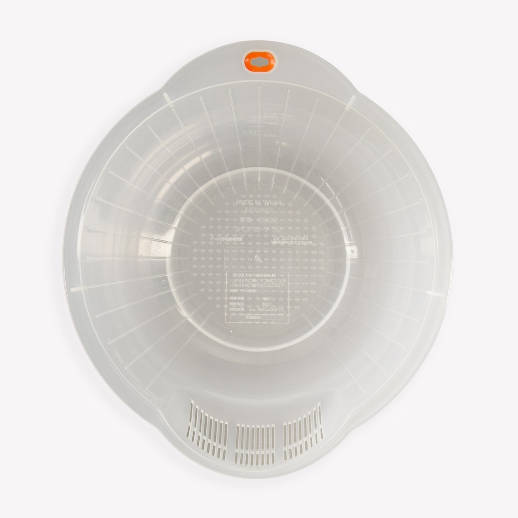 Ce modèle japonais en plastique transparent est doté d'une passoire intégrée avec des rainures de drainage à mailles fines qui permettent à l'eau de s'écouler rapidement sans risquer de perdre un seul grain. La forme facilite la circulation du riz dans l'eau - le mouvement qui libère l'amidon et donne ce résultat propre et distinctif une fois cuit.