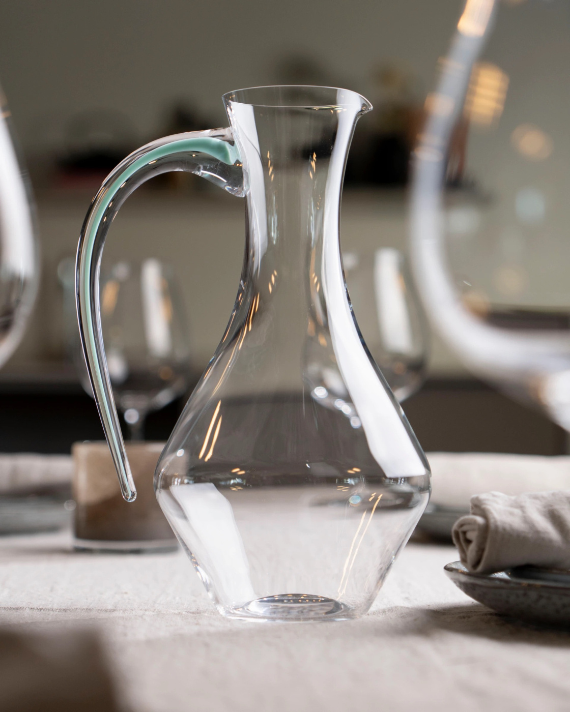 Une interprétation moderne de la carafe à vin classique. La silhouette ondulante est familière, mais la poignée artisanale - avec une masse de verre colorée dans une teinte jaune - ajoute une touche visuelle unique tout en servant de poignée pratique. La carafe contient 1500 ml, l'équivalent d'une bouteille de vin standard.