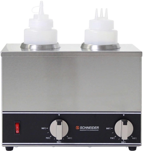 Un chauffe-bouteille pour les cuisines servant des sauces chaudes, émulsions ou huiles directement depuis une bouteille souple pendant le service. Le modèle électrique de Schneider chauffe sans bain-marie: la bouteille repose dans un compartiment enveloppant qui maintient la température par contact direct et air chaud, ce qui signifie qu'il n'y a pas d'eau à changer, pas de rouille et un entretien minimal entre les services. La température est réglable en continu entre 40 et 90°C, couvrant tout d'un beurre blanc à température de service jusqu'à une garniture de piment fort sans risquer la surchauffe des émulsions délicates.