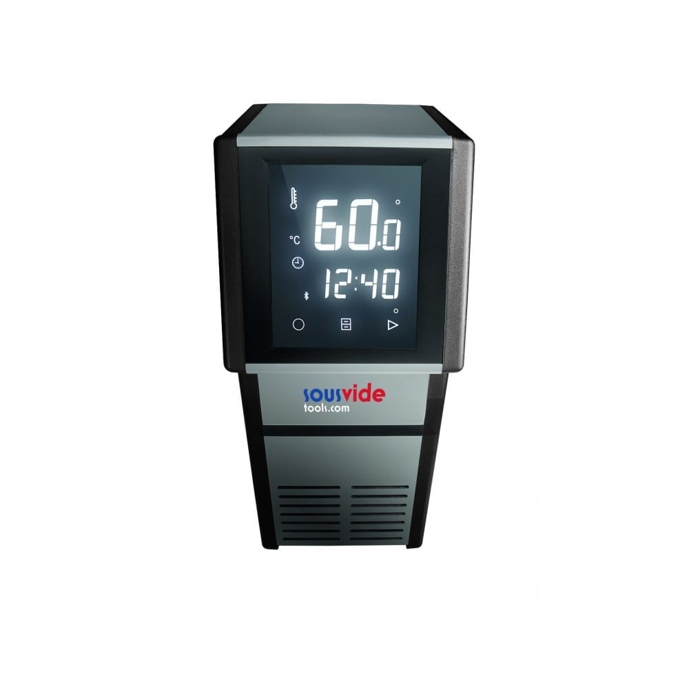 Dernière présentation du circulateur SousVideTools® iVide avec un écran tactile large et haute résolution de 5 pouces pour la programmation. Le circulateur iVide est équipé du Bluetooth, ce qui signifie que vous pouvez le contrôler à distance. L'application ne rend pas seulement la cuisine sous-vide plus accessible, elle est également conçue pour garantir la sécurité alimentaire. Il garantit une stabilité de température de 0,03°C entre 40°C et 100°C sur tout récipient jusqu'à 80 litres, et se remonte rapidement sur tout autre récipient grâce à sa pince conçue à l'arrière.