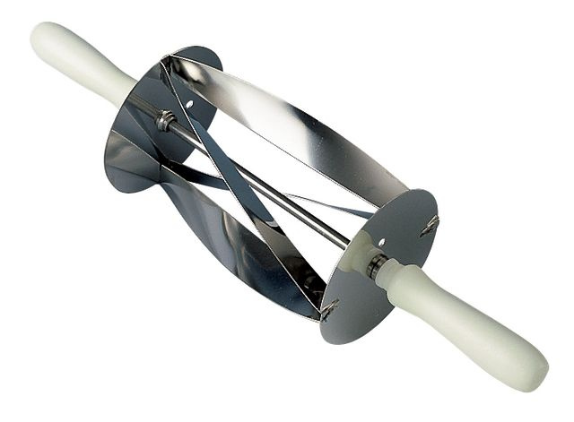 Cutter intelligent que vous faites rouler sur votre pâte à croissant comme un rouleau à pâtisserie. Il produit des triangles d'une base de 180 mm et d'une hauteur totale de 200 mm, que vous demandez ensuite au stagiaire d'enrouler pour obtenir des gaffes fantaisistes. Poignée en plastique et mécanique en acier inoxydable.