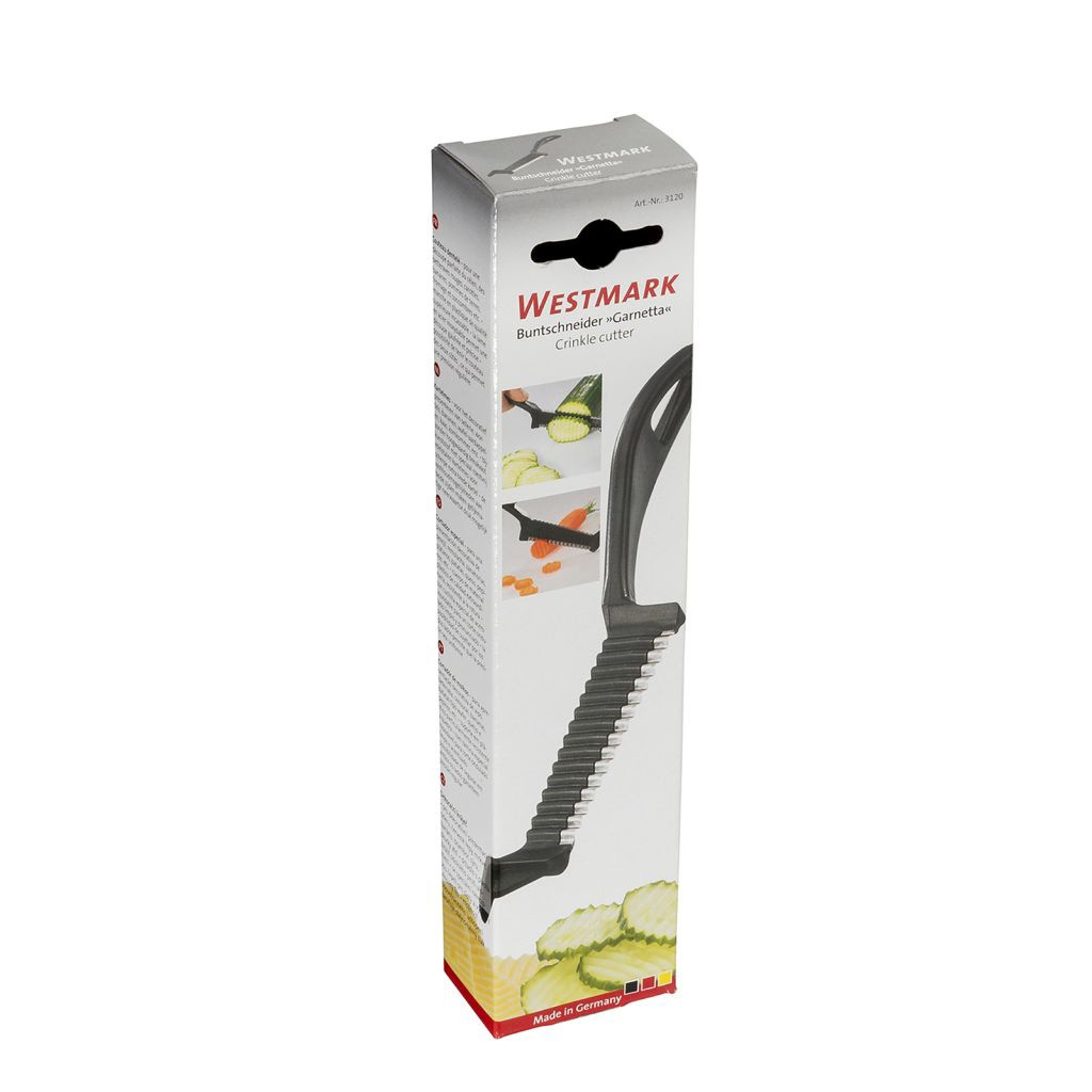 Grâce à ce couteau pratique, vous pouvez rapidement donner aux légumes, aux fruits ou au fromage une coupe ondulée décorative. Grâce à sa lame tranchante en acier inoxydable et à ses deux poignées, il est particulièrement facile et sûr à utiliser, même avec des légumes durs. Créez des décorations saines pour les buffets ou des croustilles de légumes maison comme finger food pour votre fête.