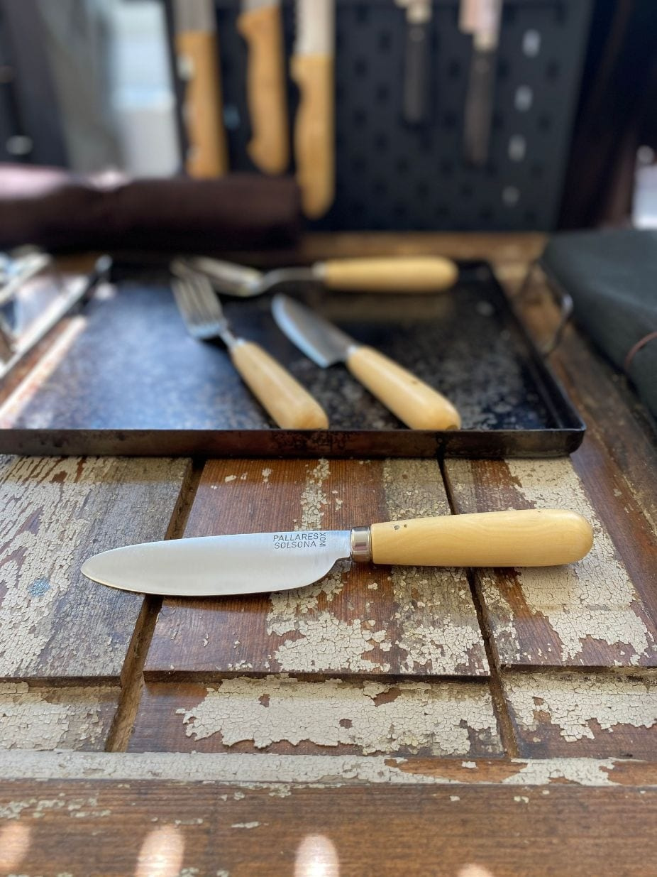 Le couteau Sobrasada a une lame en acier inoxydable et un manche en bois de buis. Bien sûr, il convient à bien d'autres choses que la sobrasada et est idéal pour les pâtés, les pâtisseries, le fromage et d'autres choses amusantes.