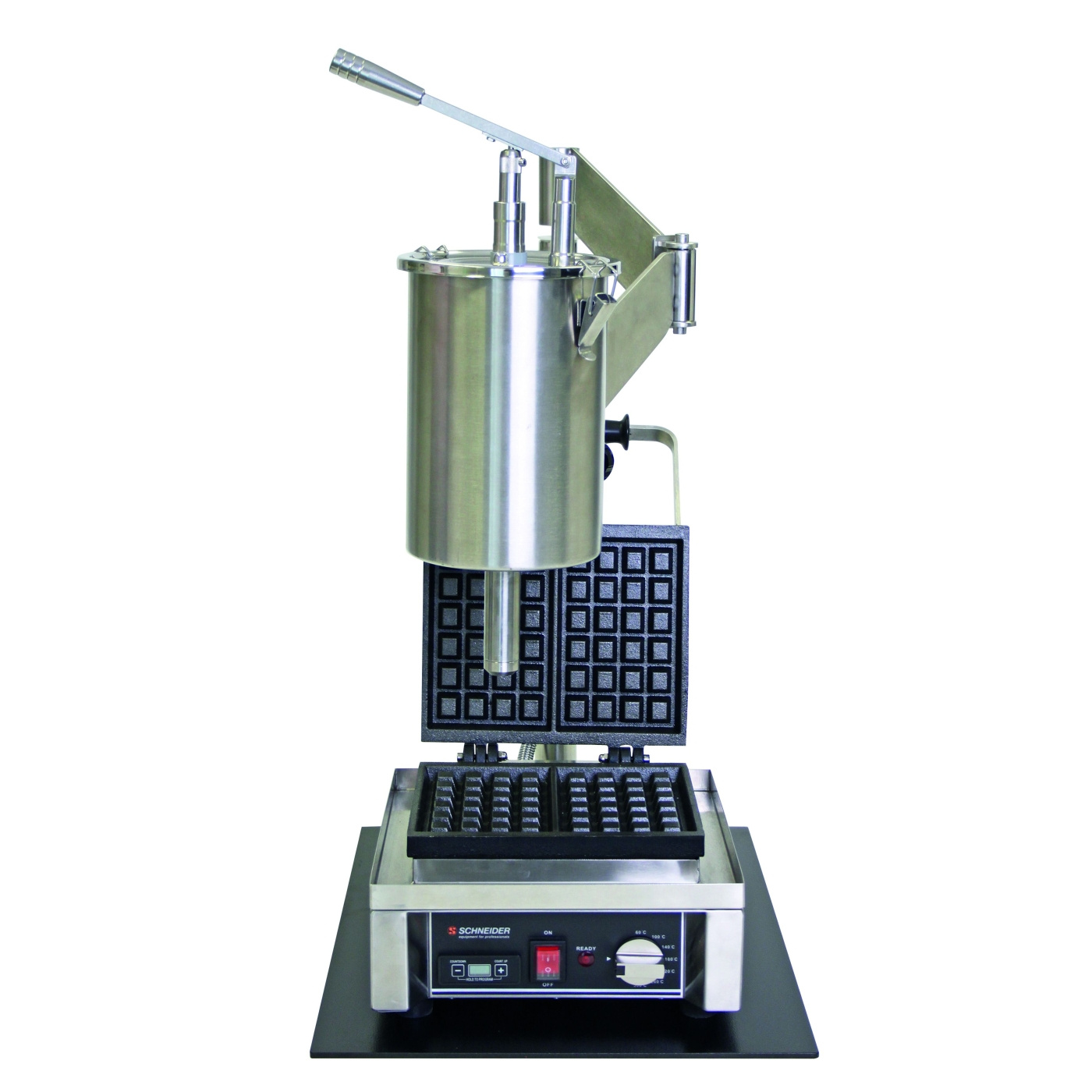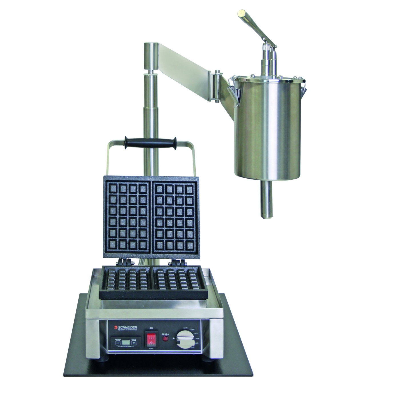 L'embout de sortie est orientable et peut être positionné exactement au-dessus de la surface de l'appareil sans déplacer le support. Le dosage s'effectue via un levier et délivre ±50 ml par pression, assurant une taille de portion constante pour chaque gaufre tout au long d'un service complet. Le support occupe une surface au sol de 450x450 mm et mesure 1.000 mm de haut.