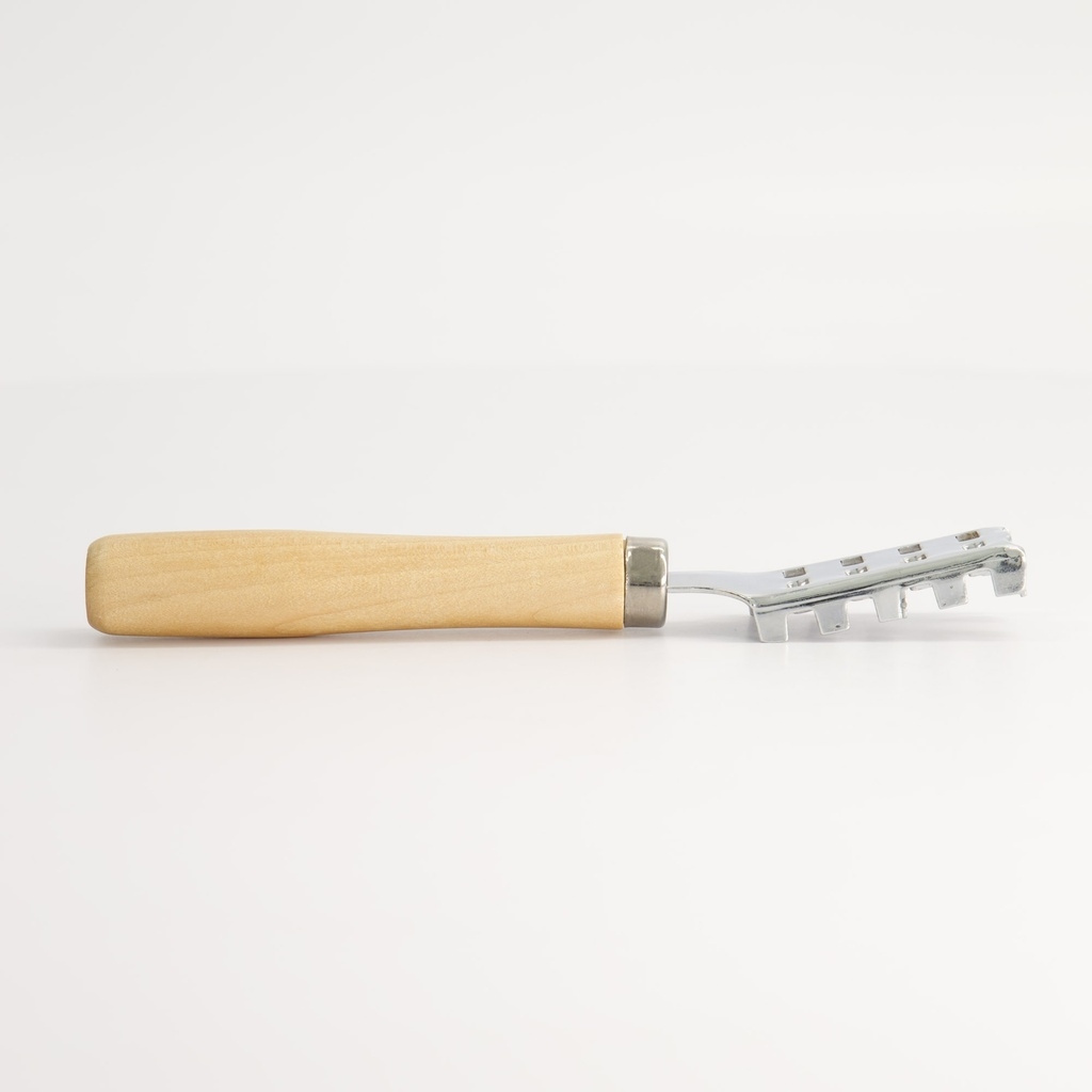 "Il ne s'agit pas d'une brosse à dents robotisée, mais d'un écailleur de poisson japonais (uroko tori en japonais). Au lieu d'arracher, il ""soulève"" les écailles du poisson sans endommager la peau ou la chair qui se trouve en dessous. Ce modèle à manche en bois et tête en fer est un classique des comptoirs à poisson japonais et des cuisines à sushi.