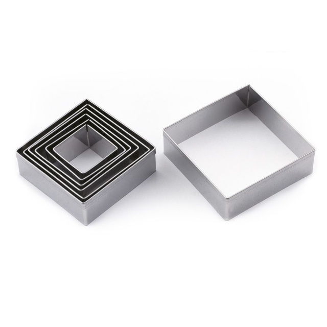 Un set de sept pièces pour découper des gâteaux, des raviolis, de la pâte à sucre, du pain d'épices ou tout autre objet en jolis carrés. Parfait pour ceux qui veulent faire des gâteaux qui ressemblent à une fenêtre, à des yeux qui ont trop regardé la télévision, à l'écran de fumée de l'école ou à toute autre chose festive. Fabriqué en acier inoxydable. Les sept pièces sont de tailles différentes, la plus grande 65x65 mm et la plus petite 27x27 mm.