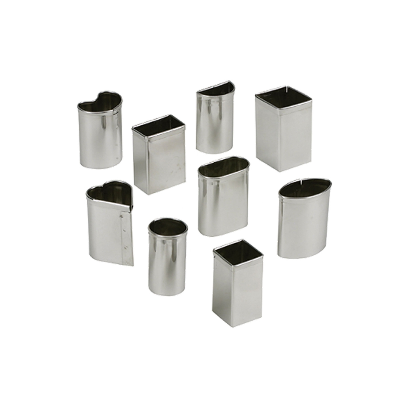 • L'ensemble contient neuf emporte-pièces en inox en neuf formes classiques pour petits fours : arc, courbe, diamant, cœur, ovale, ovale rond, rond, rectangle et carré. La variété des formes couvre le répertoire traditionnel des petits fours et permet une mise en forme cohérente sans changer de jeu d'outils.