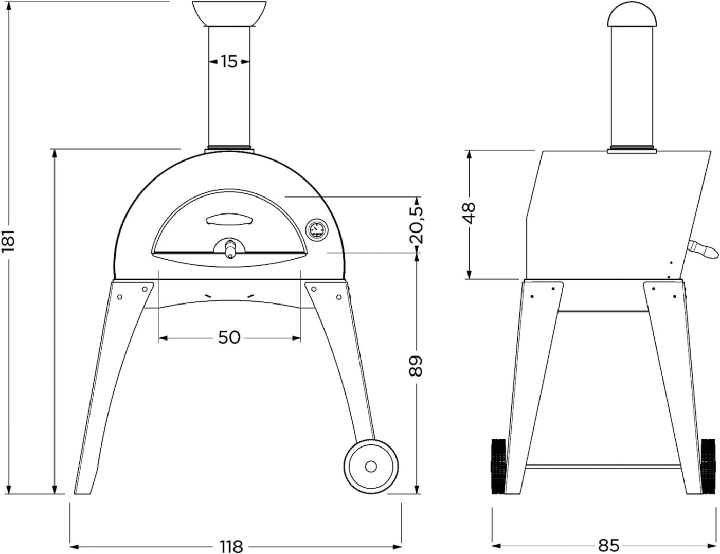 Dimensions incluant la cheminée, le support et la porte montée : Largeur 118cm, Profondeur 85cm, Hauteur 181cm.
