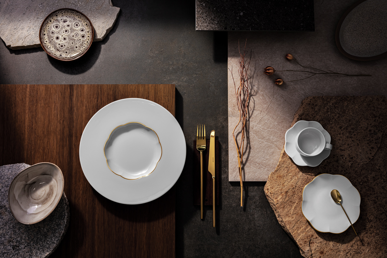 C'est de l'or, mais avec dextérité et une finesse ultramoderne, tout en restant la quintessence de la porcelaine fine. Sonetto Oro fait évoluer la forme poétique de Sonetto vers un niveau supérieur, avec de subtils détails dorés qui rehaussent l'ensemble de la table sans pour autant crier au luxe. Il s'agit de finesse plutôt que de glamour, ce qui le rend parfait pour le dîner du Nouvel An et pour le restaurant de l'hôtel qui souhaite se démarquer un peu. Vous pouvez l'assortir à Bianco ou laisser Oro être la pièce maîtresse dorée de la série.