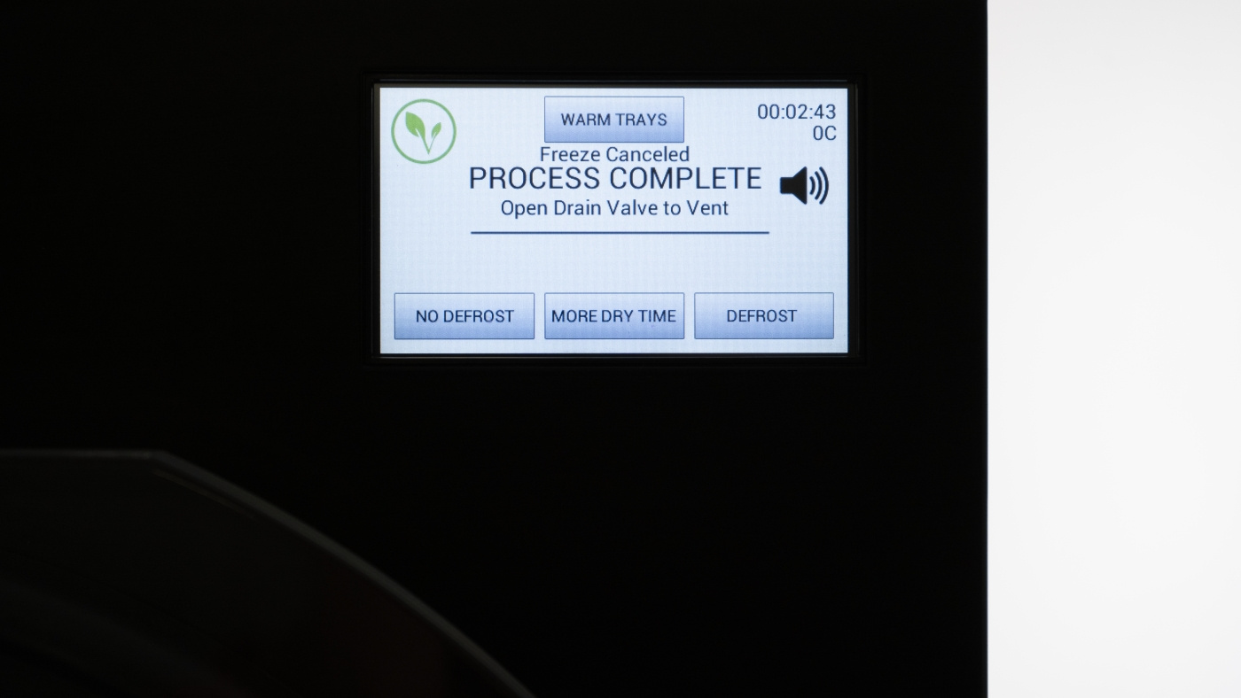 Pour nettoyer, réglez le mode décongélation et ouvrez le robinet. La couche de glace qui s'est formée autour de la chambre va se décongeler complètement, et après un nettoyage complet, vous pouvez commencer un nouveau processus de lyophilisation.