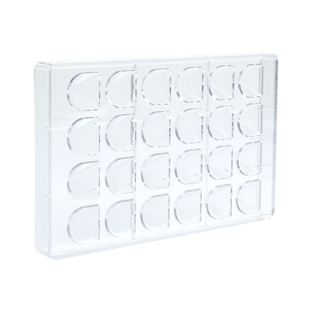 Moule à pralines en plastique dur qui forme un cône avec un côté lisse. Chaque moule peut contenir 24 chocolats de 9g. Le moule mesure 275 x 175 mm.