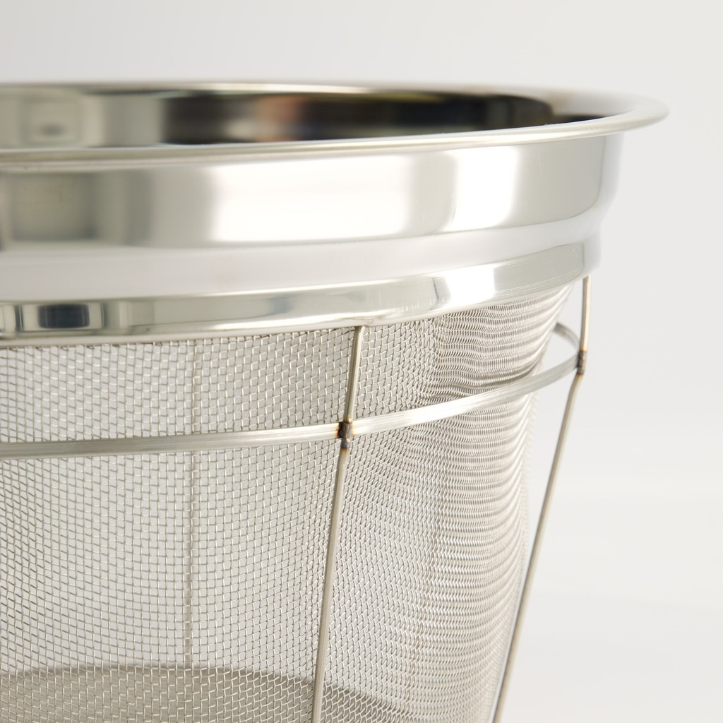 • Une passoire professionnelle japonaise zaru en acier inoxydable avec une forme profonde et conique qui la rend parfaite pour rincer, filtrer et refroidir rapidement les nouilles, le riz ou les légumes. Cette passoire est souvent utilisée dans les cuisines professionnelles de ramen, où la précision du rinçage influe à la fois sur la texture et la saveur. La forme haute permet à l'eau de s'écouler efficacement sans que les nouilles ou le riz ne se collent les uns aux autres. Le bord large et stable permet au zaru de se tenir fermement sur les bols ou les casseroles, et la base surélevée empêche tout contact avec les éclaboussures.