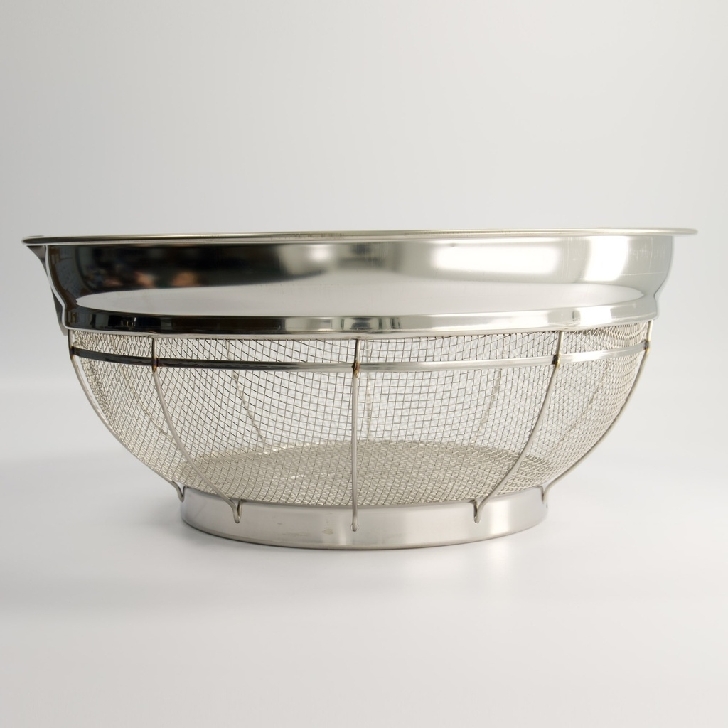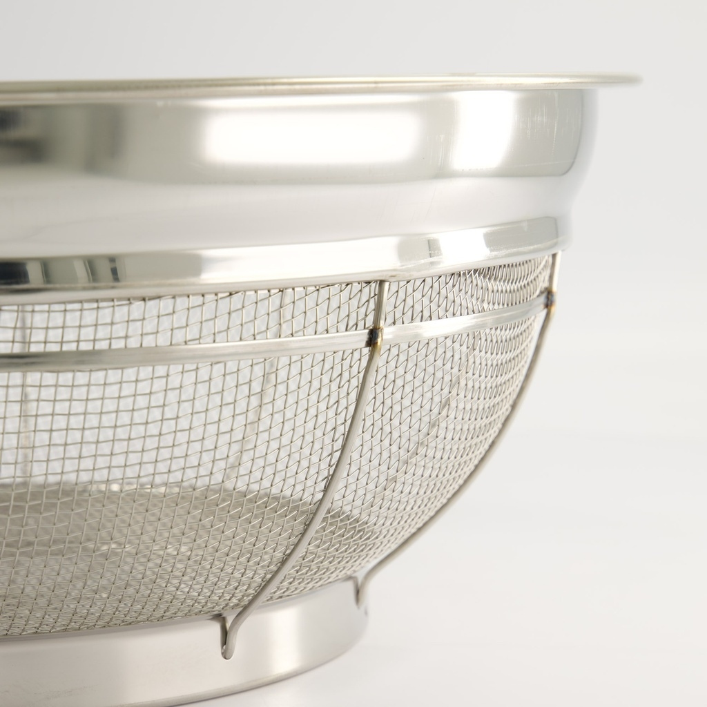 • Une passoire japonaise professionnelle en acier inoxydable (zaru), conçue pour la précision dans la cuisine. La forme peu profonde et la structure dense du treillis métallique permettent à l'eau de s'écouler rapidement sans coller aux ingrédients, ce qui la rend idéale pour les nouilles, les légumes, le tofu et le riz.