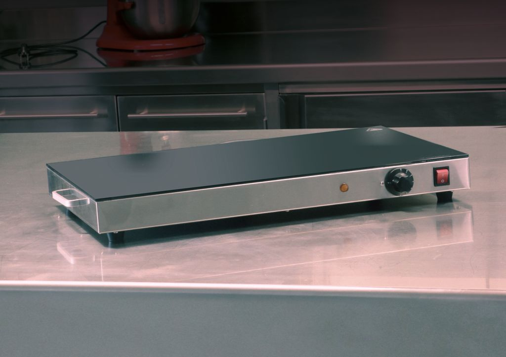 Plaque chauffante électrique avec plateau en verre trempé. Réglable à des températures allant jusqu'à 85°C. Fonctionne pour garder au chaud sur un buffet, mais est principalement conçu comme un outil pour la confiserie et le travail du chocolat. Un compagnon parfait pour faire fondre légèrement le bord d'une moitié de l'œuf en chocolat à assembler.
