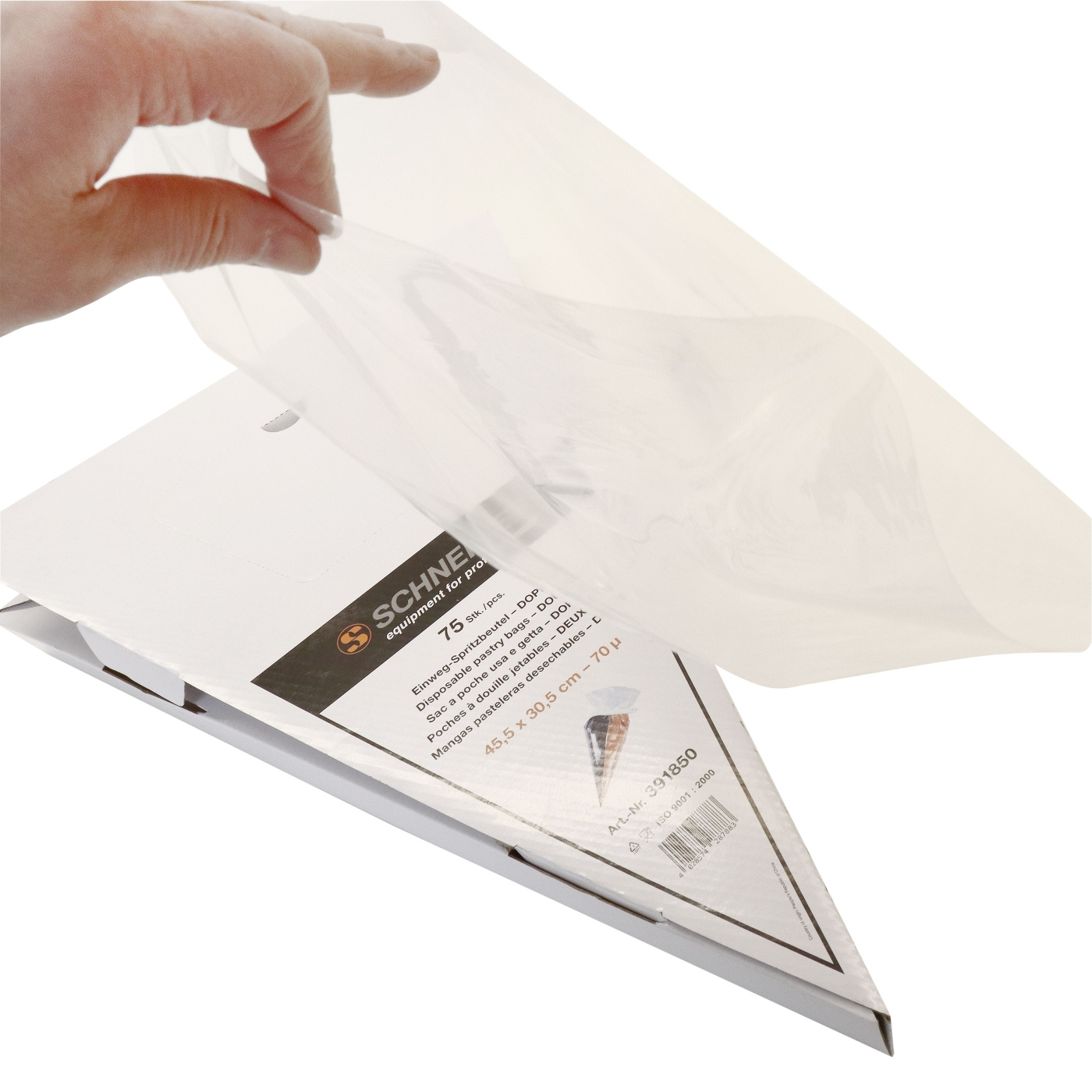 Matériau doublement extrudé avec surface intérieure lisse et haute résistance de la soudure. La pointe est fermée et la poche peut être utilisée sans douille. Transparente, en liasse, 455×305 mm. Emballage de 75 poches avec ouverture de distribution dans le carton.