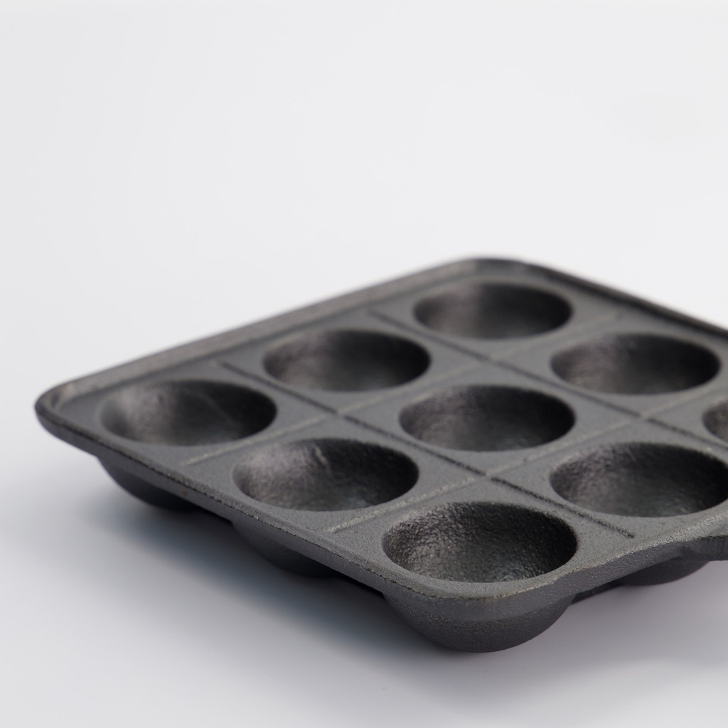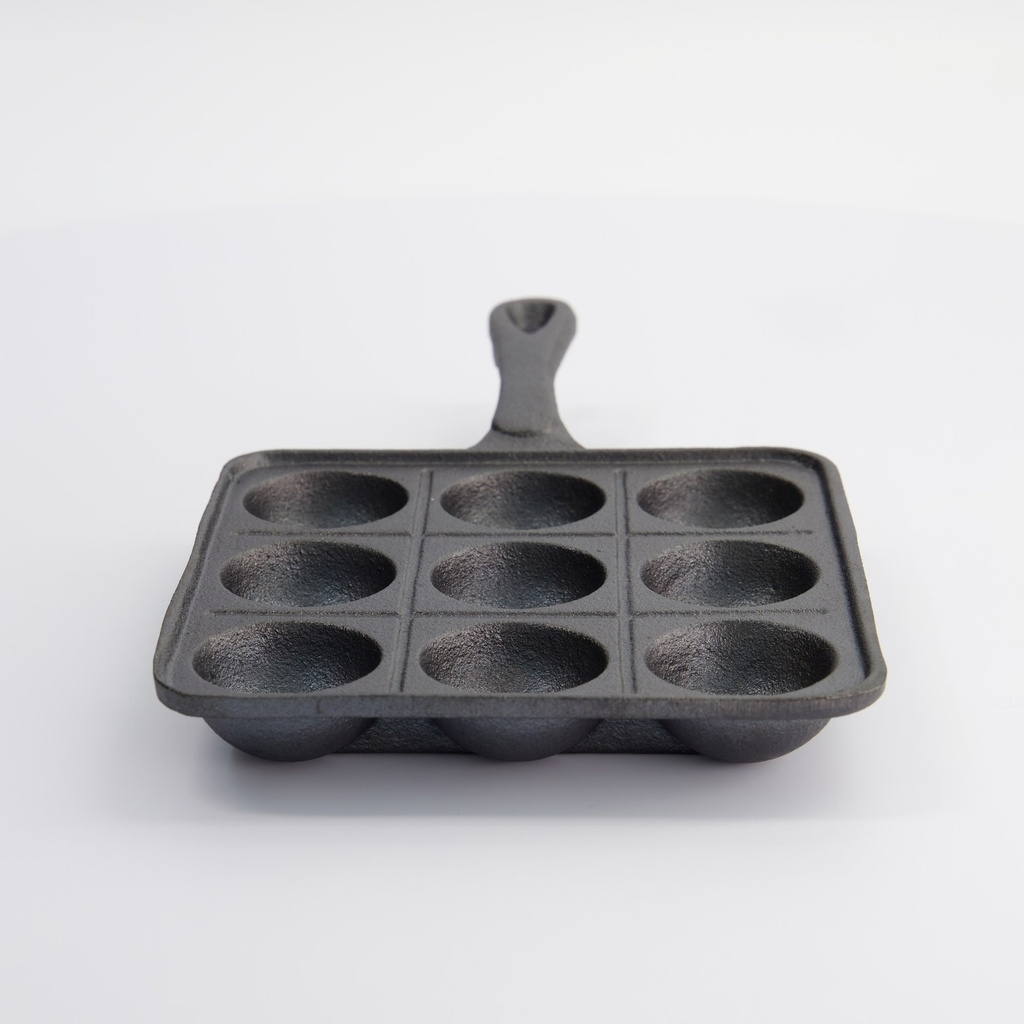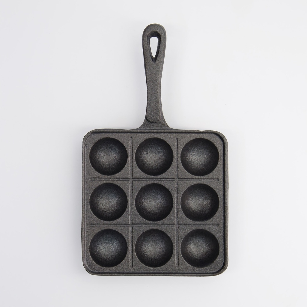 La poêle est fabriquée en fonte retenant la chaleur, ce qui permet d'obtenir une surface de friture uniforme dans chaque cavité. Le moule de neuf tasses a une profondeur généreuse qui facilite la création de boules parfaitement rondes. La fonte peut supporter une chaleur élevée, ce qui est important lorsque vous souhaitez obtenir une surface fine et croustillante tout en gardant l'intérieur moelleux. La poignée est intégrée à la fonte pour une stabilité et une longévité maximales.