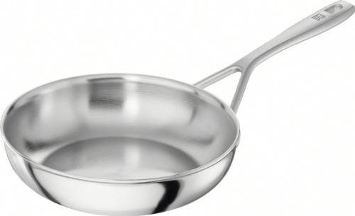 Poêle à frire en acier inoxydable de la série Sensation de Zwilling. Cette poêle convient à toutes les sources de chaleur, y compris l'induction, et se compose de cinq couches d'acier inoxydable entrecoupées d'aluminium, ce qui permet une répartition uniforme de la chaleur et une bonne rétention de celle-ci. La surface est traitée au silvionox, ce qui lui confère une finition brillante et durable. Poignées robustes en acier inoxydable sablé, résistantes aux traces de doigts et n'absorbant pas la chaleur pendant la cuisson.