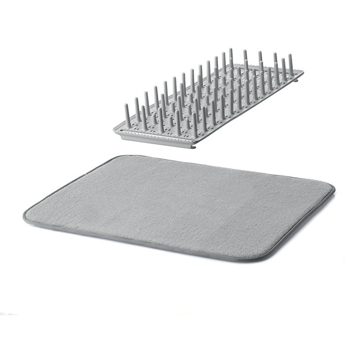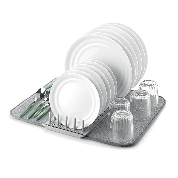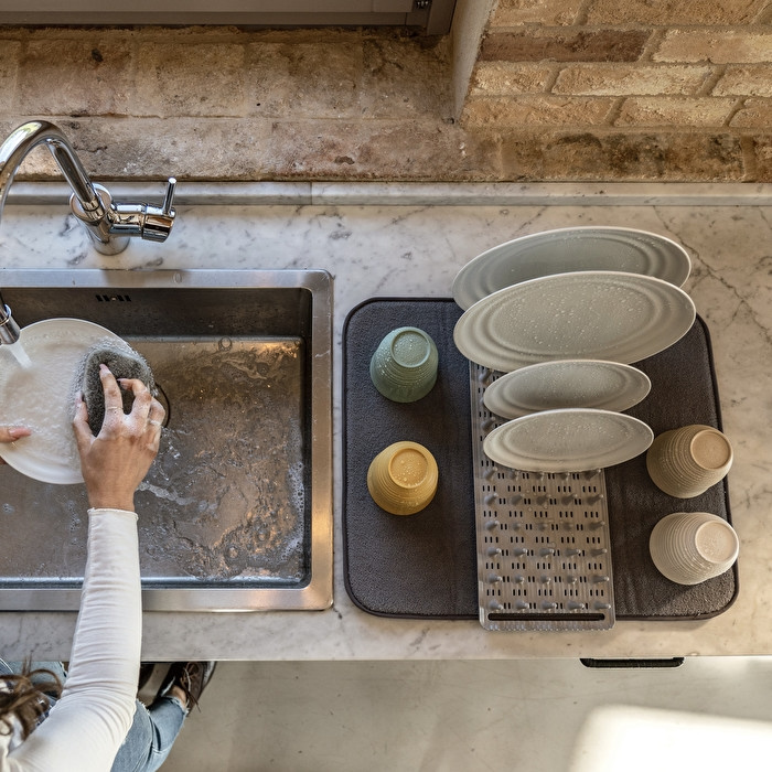 Modèle un peu plus simple fabriqué à partir de plastique recyclé correspondant à 3,6 bouteilles d'essence de 1,5 litre. Ne vous laissez pas décourager par la simplicité, mais plutôt inspirer ! Parfait pour ceux qui ont un lave-vaisselle et qui font parfois la vaisselle à la main. Parfait dans une petite kitchenette où il peut être plié et rangé entre les tournées. Simple et facile à emporter dans un chalet d'été ou une caravane. Le support peut accueillir jusqu'à 12 assiettes. Le tapis est en plastique antibactérien et sèche rapidement. Il est également doux et n'abîme ni ne raye les objets que vous y déposez. Le support passe au lave-vaisselle (il est presque trop humide) et le tapis est lavable en machine. Il est facile à assembler à l'aide d'un élastique lorsqu'il est rangé.