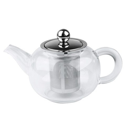 Théière en verre borosilicate de forme sphérique. Disponible en deux tailles. Le couvercle et la passoire à thé sont en acier inoxydable.