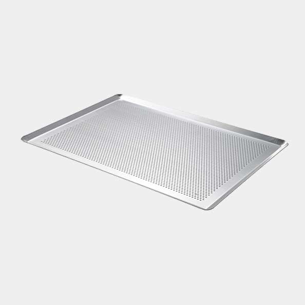 Tôle creuse perforée avec bords repliés. Fabriquée en aluminium. Principalement utilisée dans les fours à air chaud pour les produits de boulangerie auxquels on souhaite donner de l'air et donc du croustillant, comme le pain français, les baguettes, les tartes ou les pâtisseries. S'utilise également comme plaque de cuisson ordinaire en combinaison avec un tapis en silicone. Disponible en trois tailles : 40 x 30 cm, 53 x 32,5 cm (GN 1/1) et 60 x 40 cm.